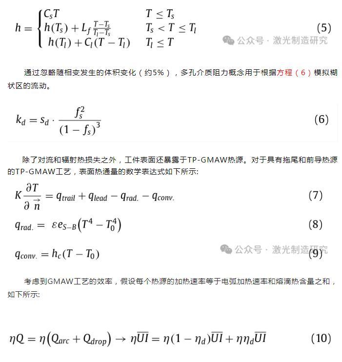 除了對(duì)流和輻射熱損失之外,工件表面還暴露于TP-GMAW熱源。對(duì)于具有拖尾和前導(dǎo)熱源的TP-GMAW工藝,表面熱通量的數(shù)學(xué)表達(dá)式如下所示: