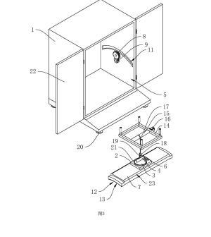 參照圖2和圖3,調(diào)平結(jié)構(gòu)包括調(diào)節(jié)板7、齒輪一8、齒輪二9和用于驅(qū)動齒輪二9轉(zhuǎn)動的旋鈕10,調(diào)節(jié)板7轉(zhuǎn)動連接于殼體1內(nèi),殼體1上開設有供調(diào)節(jié)板7移動的滑槽11,調(diào)節(jié)板7的底面呈弧形凹面12設置且弧形凹面12上開設有齒槽13,調(diào)節(jié)板7頂面的兩側(cè)邊倒有倒角23;齒輪一8和齒槽13嚙合;齒輪一8和齒輪二9均轉(zhuǎn)動連接于殼體1上,齒輪一8和齒輪二9嚙合,齒輪二9的齒數(shù)小于齒輪一8的齒數(shù),從而達到一個減速的作用,旋鈕10設置于殼體1外。