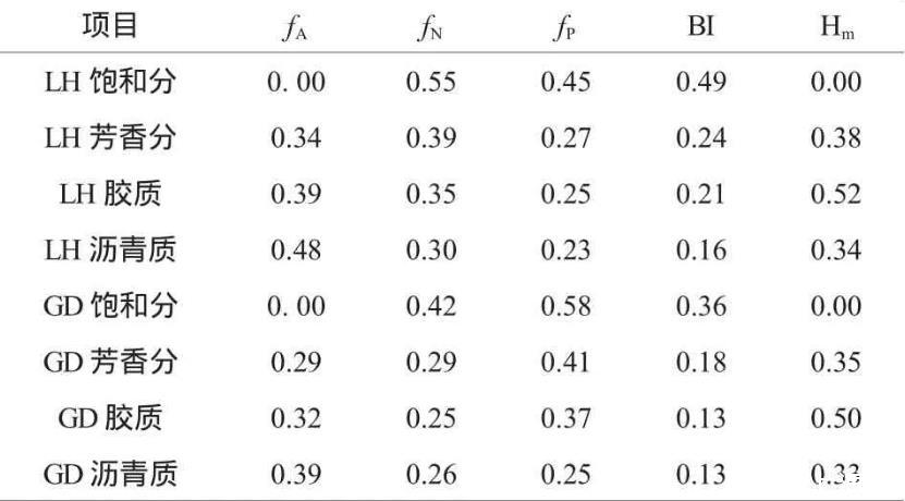 可以看出,隨著組分的增重,兩種稠油組分系類列的fA逐漸變大,fN、fP、BI逐漸變小。兩個系列的不同在于,遼河稠油組分的fA、fN和BI均大于孤島稠油組分,即芳香碳率、環烷碳率、烷鏈支化度較高。因此,遼河稠油組分中共軛成分含量大于孤島稠油組分。