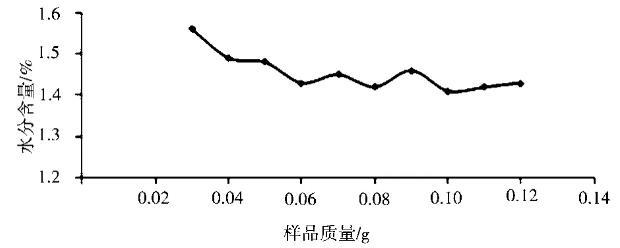 在150℃加熱10 min的測定條件下,樣品稱樣量也會對測定結果有影響[4]。分別稱取0.03g、0.04g、0.05g、0.06g、0.07g、0.08g、0.09 g、0.10g、0.11g、0.12g的樣品質量,考察樣品稱樣量對測定結果的影響,結果見圖1。從圖中可以看出,儀器測得樣品水分含量隨著加入樣品質量的增大逐漸趨于穩定,當單次加入的樣品質量較小時,測得結果偏高[5]。稱量樣品質量在50~120 mg結果無明顯差異。