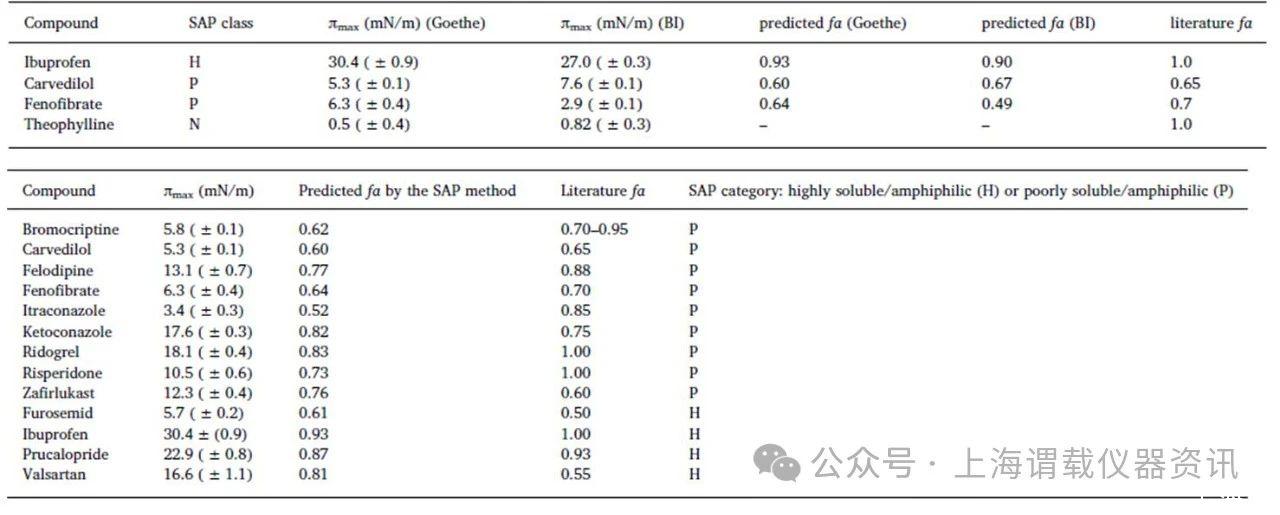 在LCs(先導(dǎo)藥物)的早期研究中,只有少量的化合物可用,如果化合物是兩親性的,SAP方法似乎是獲得fa的一個有效且快速的工具。只需要少量的LC原液的解決方案(50μl)通過Delta-8儀器進行分析,而沒有采用進一步分析如高效液相色譜法分析,高效液相色譜法盡管其簡單,能夠預(yù)測廣泛化合物的藥物的生物利用度(fa),包括高溶性和低溶性的兩親性化合物。而對于難溶性和高溶性兩親性化合物,改進的SAP(表面活性譜法)預(yù)測fa值與文獻報道的藥物分子的fa值相近。但是此方法不適合預(yù)測非兩親性藥物的fa值。