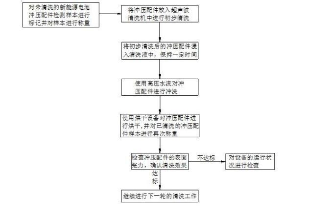 此沖壓配件的表面張力改善方法,就是通過將同一生產(chǎn)批次的沖壓配件放入超聲波清洗機(jī)中,超聲波清洗機(jī)產(chǎn)生的超聲波的高頻振動(dòng)能夠產(chǎn)生微小的氣泡,這些氣泡在液體中爆裂時(shí)會(huì)產(chǎn)生沖擊力,對(duì)沖壓配件進(jìn)行初步清洗。然后,將經(jīng)過初步清洗的沖壓配件放入事先配置好的碳?xì)淝逑匆褐校M(jìn)一步去除沖壓配件表面的氧化物和殘留物。再將經(jīng)過清洗液清潔處理過的沖壓配件取出,并使用高壓水流對(duì)清潔后的沖壓配件進(jìn)行沖洗,去除表面上的頑固污漬和顆粒,確保沖壓配件上的清洗液和殘留物被徹底清除。通過多重的清洗流程,有效提升新能源電池沖壓配件表面的清潔度,能夠達(dá)到理想的清洗效果,有效改善新能源電池沖壓配件的表面張力。