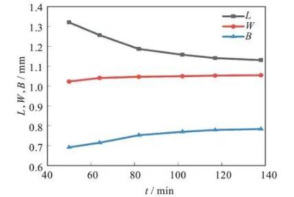 圖7為數(shù)值仿真過(guò)程中液滴三軸隨時(shí)間演化規(guī)律。綜合對(duì)比圖4和圖7,數(shù)值仿真軟件與實(shí)驗(yàn)過(guò)程中球形液滴的三軸長(zhǎng)度變化趨勢(shì)基本一致。可以看出,在體積保持不變的假設(shè)下,球形液滴的第二半軸和第三半軸變形頻帶是不一致的。該結(jié)果表明一些黏彈性液滴的變形和收縮不嚴(yán)格符合仿射變形假設(shè)(即第三半軸W始終等于第二半軸B),這與文獻(xiàn)結(jié)果類似。數(shù)值仿真結(jié)果中液滴最終形態(tài)不是一個(gè)三軸長(zhǎng)度相等的球形,主要原因是仿真過(guò)程中使用的非牛頓流體的本構(gòu)模型只對(duì)黏性項(xiàng)進(jìn)行了修改,而忽視了彈性應(yīng)力的影響,因此與理論計(jì)算結(jié)果有一定誤差。