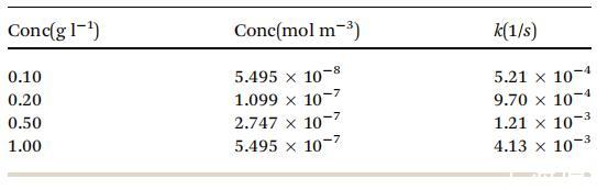 表 2 不同濃度的速率常數 k(1/s) 值 由圖 6 中的實驗曲線計算