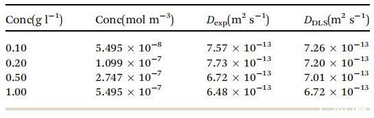 表 1 擴散系數 D (m2 s- 1 ) 對于各種 從實驗 G vs. t1/2 曲線計算的濃度 與使用 DLS 測量的相比