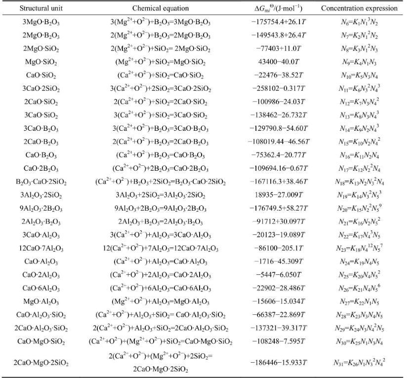 表1 MgO-B2O3-SiO2-CaO-Al2O3渣系中復雜分子的化學反應及標準Gibbs自由能和作用濃度的表達式