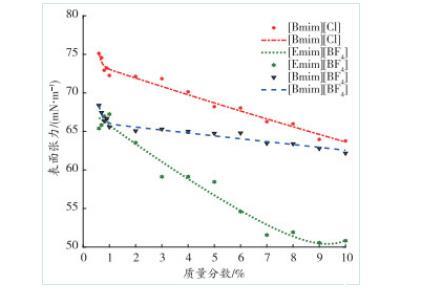 2)在離子液體質量分數繼續增大到一定階段后,表面張力逐漸趨于穩定。這是由于當質量分數繼續增大到一定值時,陰陽離子形成膠束,此時質量分數增大對表面張力的影響較小。分析得出3種離子液體單一溶液對降低表面張力的能力大小為[Emim][BF4]>[Bmim][BF4]>[Bmim][Cl]。