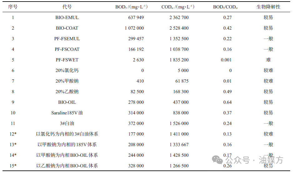 表1降解性數(shù)據(jù)注:標(biāo)*的樣品配方為:240 mL基液+20 g/L BIO-EMUL+15 g/L BIO-COAT+60 mL內(nèi)相鹽溶液。