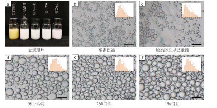 圖2不同油脂制備的W/O型Pickering乳液的表觀照片、微觀照片及粒徑分布圖:a.表觀照片;b.霍霍巴油;c.鯨蠟醇乙基己酸酯;d.異十六烷;e.26#白油;f.15#白油;所有比例尺均為50μm