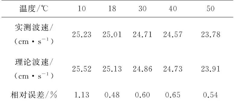 將之前得到的多組表面張力系數(shù)和波長數(shù)據(jù)代入式(1)中計(jì)算理論波速,再與實(shí)驗(yàn)中的實(shí)測波速作比較,便可以通過實(shí)驗(yàn)驗(yàn)證水波波速與其表面張力關(guān)系公式的的正確性。在不同溫度下,實(shí)際測得的波速、由原理公式計(jì)算出的理論波速以及兩者的相對誤差數(shù)據(jù)列于表5。