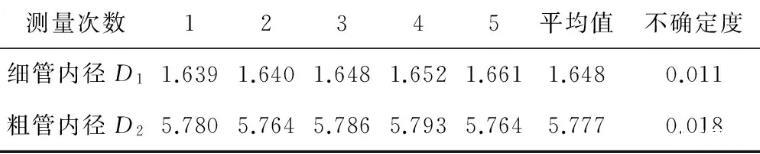 在組裝不等徑U型管之前,用讀數(shù)顯微鏡分別測量兩支玻璃管的內(nèi)徑,取5次測量的平均值,記為D1、D2.測量數(shù)據(jù)列于表1.