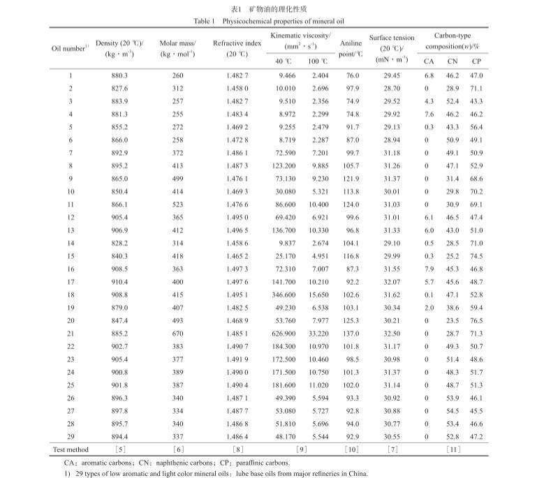 29種常見的低芳淺色礦物油:取自國內主要煉油廠的潤滑油基礎油,包括主要的石蠟基基礎油和環烷基基礎油,不包括深色高芳烴礦物油;從精制程度看,包括高壓加氫深度精制油品,也包括溶劑精制和白土精制工藝精制油品;從碳型結構看,包括芳環碳(CA)含量為零的油品,也包括CA含量小于10%(w)的油品。礦物油的理化性質見表1。