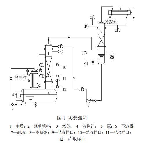 實(shí)驗(yàn)流程如圖1所示。實(shí)驗(yàn)裝置由主塔、副塔、冷凝系統(tǒng)、加熱系統(tǒng)四大部分組成。主塔為內(nèi)徑400mm的不銹鋼精餾塔,填料層裝填高度1.8m,每盤填料高200mm,共9盤。主塔塔頂上升蒸汽及其冷凝液在副塔內(nèi)進(jìn)行換熱,得到飽和的回流液,避免過冷現(xiàn)象的發(fā)生。塔釜再沸器采用熱導(dǎo)油加熱,換熱面積為27.5m2。塔頂冷凝器采用冷卻水制冷,換熱面積為29.9m2。實(shí)驗(yàn)采用常壓下的全回流操作。