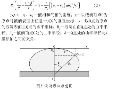 靜滴法是根據(jù)在水平墊片上自然形成的液滴形狀(如圖2所示)以及Young-Laplace方程來計算表面張力,式(2)即為靜滴法根據(jù)液滴外形計算表面張力的基本方程: