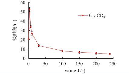 通過測試接觸角評價兩親性碳點的吸附性能,接觸角測定依據標準SY/T 5153—2017《油藏巖石潤濕性測定方法》。具體實驗步驟如下:將玻璃板浸泡在現配的食人魚溶液(濃硫酸∶雙氧水=3∶1)中1 min,進行表面羥基化的親水處理,再洗凈烘干;將玻璃板下半部浸泡在表面活性劑溶液中,上半部懸空,讓溶液保持攪拌狀態,浸泡12 h后取出,自然晾干。利用光學接觸角測量儀(DSA100,Krüss,德國)測定表面活性劑溶液浸泡前后水滴在玻璃板上的靜態接觸角。玻璃的主要成分為硅酸鹽,因此可用玻璃板模擬硅酸鹽顆粒表面。通過測定玻璃板水滴靜態接觸角研究C12-CDS潤滑劑在玻璃表面的吸附性能,實驗結果見圖3。