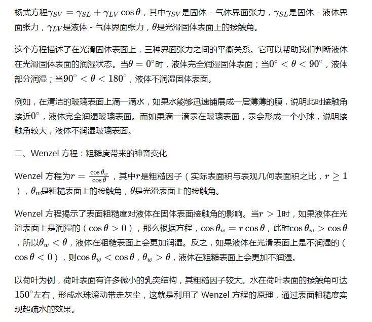 基礎(chǔ)聯(lián)系:楊式方程描述了光滑固體表面上的界面張力平衡,而Wenzel方程則在考慮表面粗糙度的情況下,建立了粗糙表面接觸角和光滑表面接觸角之間的聯(lián)系。兩者共同為我們理解液體與固體表面的相互作用提供了理論基礎(chǔ)。