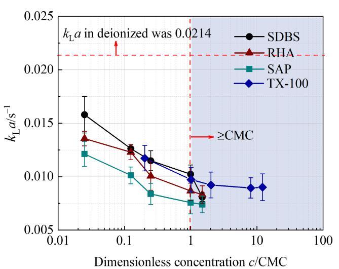 含表面活性劑微納米氣泡曝氣系統的體積傳質系數(kLa)值如圖2所示。在四種表面活性劑溶液中,kLa值均隨表面活性劑濃度增加而降低。當c/CMC小于1時,降低的趨勢更明顯。這說明少量的表面活性劑即可對傳質產生顯著影響。此外,非離子型表面活性劑對kLa的影響大于離子型表面表面活性劑。分子量大的RHA比SDBS具有更顯著的傳質抑制作用。