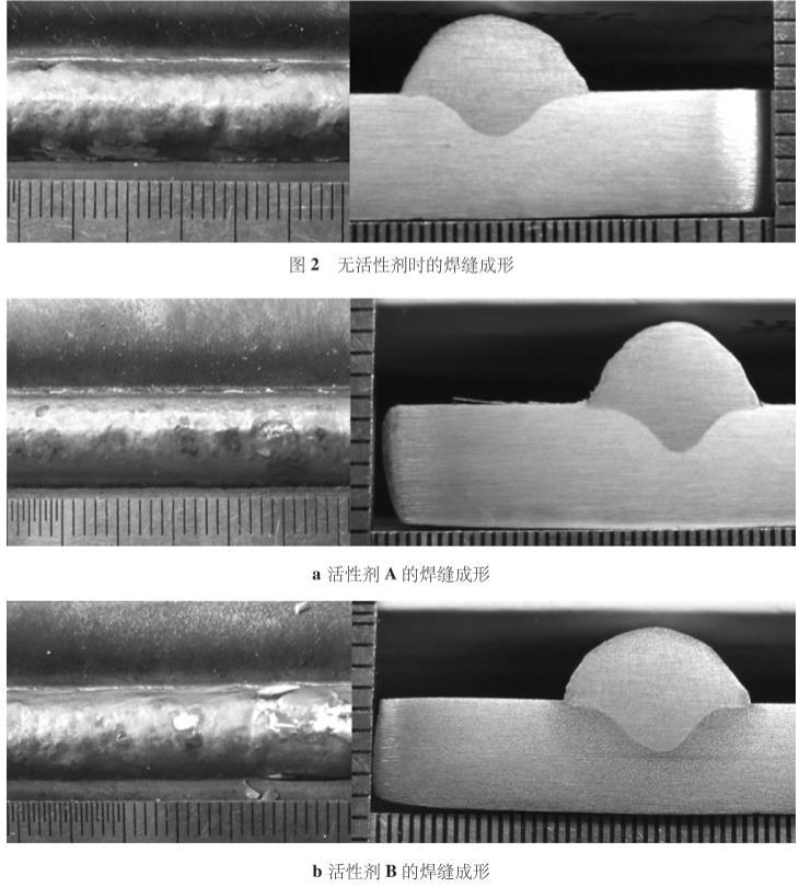 圖2是無活性劑時(shí)焊縫的宏觀成形,圖3為試驗(yàn)中幾組典型活性劑的金相截面。