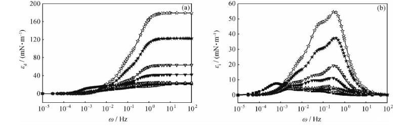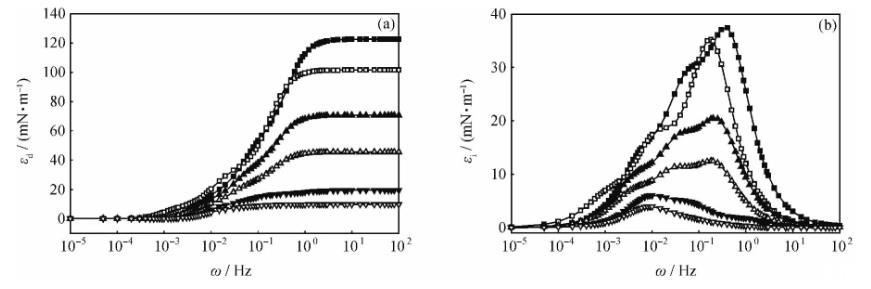 圖3含1.0%酸性組分的煤油-不同濃度HMPAM水溶液體系的界面擴張彈性(εd)和擴張黏性(εi)全頻率譜