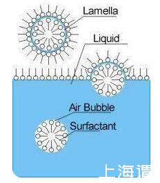 說了這么多,表面張力和泡泡到底有什么關系呢?純水的表面張力比較大,不能形成穩定的泡泡,因為泡泡的產生會增大氣液間的表面積,使得表面自由能增大,這是熱力學不穩定的。加入表面活性劑后,表面活性劑的親水基團插入水相,疏水基團豎在空氣中,這樣降低了表面張力,讓泡泡能穩定存在一段時間。從下面這張圖中可以看出,泡泡膜是三明治結構,兩側是表面活性劑,中間夾著一層水,這一三明治結構對后面泡泡水的配方至關重要。