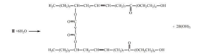 將0.12 mol聚乙二醇和0.04 mol硼酸依次裝入帶有攪拌器、分水器、回流冷凝器的三口燒瓶中,并連接減壓裝置。加熱至120℃,在負壓下進行反應至出水量不變,酯化過程如下所示: