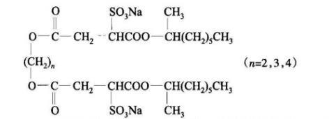 乙二醇雙子琥珀酸二仲辛酯磺酸鈉(GSS271)、1,3-丙二醇雙子琥珀酸二仲辛酯磺酸鈉(GSS371)、1,4-丁二醇雙子琥珀酸二仲辛酯磺酸鈉(GSS471)(結構式如下,實驗室自制。提純后測定,表面張力曲線無最低點,說明不含高活性雜質),實驗用水均為二次去離子水經亞沸重蒸。