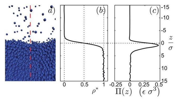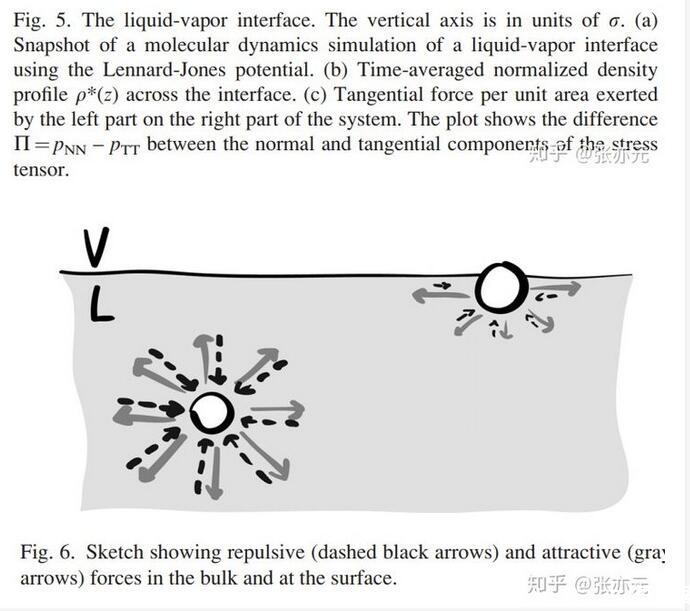 當(dāng)分子間距較小時,斥力為主,分子間距較大時,引力為主。在斥力與引力平衡時,Lennard-Jones勢能最小。現(xiàn)在,我們就可以來詳細(xì)地考慮液-氣界面了。圖5a是通過分子動力學(xué)仿真得出的液-氣界面照片,對應(yīng)的時間平均密度分布圖是圖5b。從高密度的液體到低密度的氣體發(fā)生在一個幾個分子厚度的窄區(qū)域。為了確定毛細(xì)力,我們沿垂直界面方向?qū)⑾到y(tǒng)分為兩個子系統(tǒng)(圖5a)。考慮左邊子系統(tǒng)對右邊子系統(tǒng)的單位面積的作用力,即應(yīng)力,在豎直方向上的分布。這個力有兩個來源:壓力P和額外壓力Π(圖5c)。圖5c表明有個力局部存在于界面附近,其實(shí)這個力就是表面張力,且這個力范圍和密度突變的范圍很相似。這說明表面張力的確是一個真實(shí)的力,而不僅僅是表面能的一種純數(shù)學(xué)描述。既然我們發(fā)現(xiàn)在界面附近的確局部存在一個平行的力,那我們回到問題1,為什么表面張力平行于界面而不是垂直于界面?我們注意到圖1僅僅描繪了分子間引力作用。更全面的圖應(yīng)該如圖6所示,包含了引力與斥力作用。在遠(yuǎn)離界面的液體本體內(nèi),由于液體分子周圍的完全對稱性,分子的受力完全平衡。但是,靠近界面附近的地方,上下對稱性被打破。為修復(fù)豎直方向的力平衡,向上的斥力需平衡向下的引力。而在平行于界面的方向,對稱性仍然存在,平行于界面方向的力平衡仍然存在。這就可以存在一種情況,引力作用的強(qiáng)度與斥力作用的強(qiáng)度不同。實(shí)際上,在界面附近的水平方向上,引力作用比斥力更強(qiáng),這產(chǎn)生了表面張力。