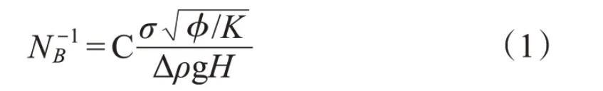 NB-1為滲吸機(jī)理判別參數(shù),式中沒有考慮巖石潤濕性。NB-1>5時,毛管力在滲吸作用中起主導(dǎo)作用;1<NB-1<5時,重力和毛管力同時起作用;NB-1<<1時,重力起主導(dǎo)作用。
