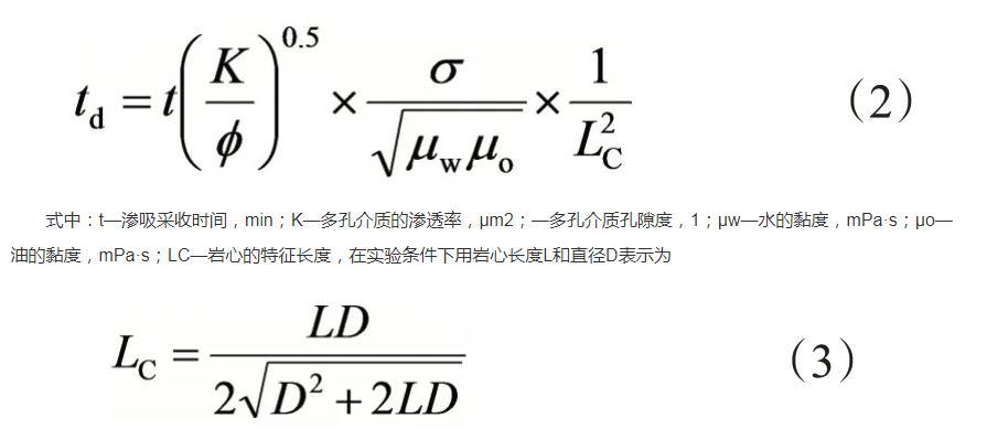 式中:t—滲吸采收時間,min;K—多孔介質(zhì)的滲透率,μm2;—多孔介質(zhì)孔隙度,1;μw—水的黏度,mPa·s;μo—油的黏度,mPa·s;LC—巖心的特征長度,在實驗條件下用巖心長度L和直徑D表示為