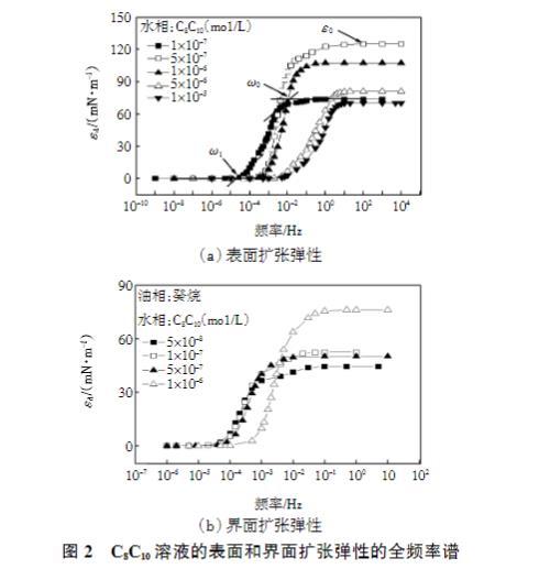 圖2 C8C10溶液的表面和界面擴張彈性的全頻率譜