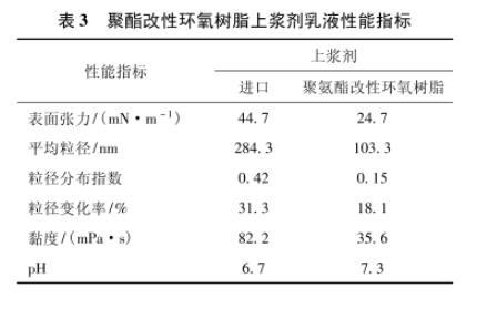 所制備的聚酯改性環氧樹脂上漿劑在核磁共振譜圖的1.6×10-6、3.8×10-6、4.8×10-6、6.8×10-6、7.2×10-6處,紅外光譜在3 309 cm-1、2 971/2 870cm-1、1 600 cm-1、1 721 cm-1以及1 103 cm-1等處出現甲基、苯環、聚酯、聚醚的特征吸收峰,表明結構中存在聚酯多元醇、雙酚A聚醚陰離子表面活性劑等組分。雙酚A聚醚陰離子表面活性劑具有優異的乳化性能和極低的浸潤性能,在和聚酯多元醇配合的情況下,可顯著降低上漿劑乳液的表面張力,提高上漿效率,增強上漿均勻性和穩定性。