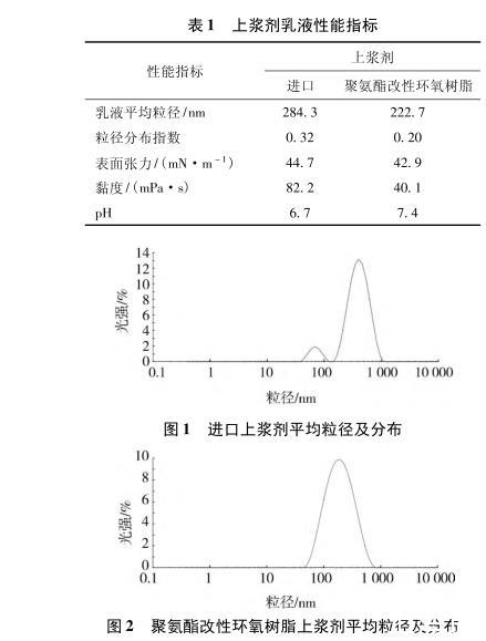 制備的聚氨酯改性環氧樹脂上漿劑乳液性能測試結果見表1,粒徑及分布測試結果見圖1~2。