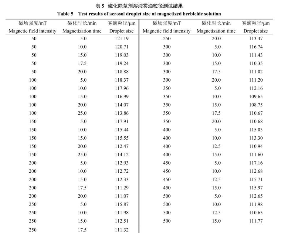 3)除草劑溶液經磁化作用后,其噴霧霧滴粒徑可由122.47μm下降到108.75μm,下降11.20%,有效減小霧滴粒徑且符合最佳生物霧滴粒徑要求,為除草劑溶液噴施作業中霧化特性控制提供新的參考。