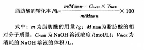 脂肪酸轉(zhuǎn)化率的測定:以酚酞為指示劑,用0.05mol/L NaOH溶液滴定反應(yīng)液中未反應(yīng)完的脂肪酸量。計(jì)算脂肪酸的反應(yīng)轉(zhuǎn)化率。
