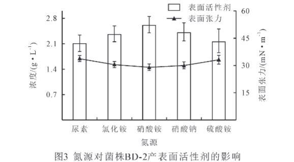 氮源在微生物生長和酶的合成中起著重要作用。由圖3可得,氮源種類對菌株BD-2產(chǎn)表面活性劑的影響存在顯著差異,以硝酸銨、硝酸鈉和氯化銨為氮源時,菌株BD-2產(chǎn)表面活性劑的量顯著高于尿素和硫酸銨(P<0.05),其產(chǎn)表面活性劑量大小依次為硝酸銨>硝酸鈉>氯化銨>硫酸銨>尿素;以硝酸銨、硝酸鈉和氯化銨為氮源時,菌株BD-2能顯著降低發(fā)酵液表面張力(P<0.05),表面張力大小依次為尿素>硫酸銨>氯化銨>硝酸鈉>硝酸銨。以硝酸銨為氮源時,表面活性劑量最高,為2.40 g/L,而表面張力最低,為29 mN/m。研究結(jié)果表明,硝酸銨有利于菌株BD-2產(chǎn)表面活性劑,而硝酸鈉和氯化銨效果不明顯,因此,選擇硝酸銨為菌株BD-2的最適氮源。