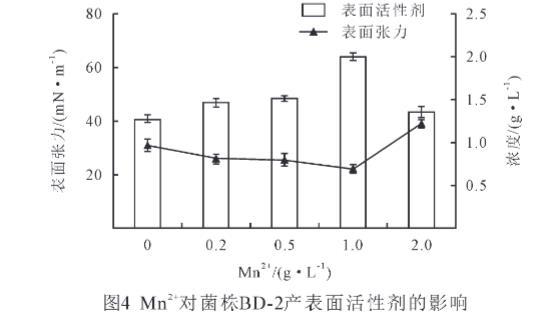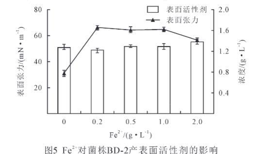 不同Mn2+、Fe2+濃度對菌株BD-2產(chǎn)表面活性劑的影響不同。由圖4可見,隨著Mn2+濃度的增加,表面活性劑量呈現(xiàn)先升高后降低的趨勢,而表面張力先下降后升高。Mn2+濃度0.5~1 g/L,表面活性劑量明顯升高,在1 g/L時,表面活性劑量最大,為2 g/L,而表面張力從30.9 mN/m下降到26.2 mN/m。在1%以后,表面活性劑量顯著下降(P<0.05),由2g/L下降到1.36 g/L,而表面張力顯著上升(P<0.05),由26.2 mN/m上升到39.2 mN/m。結(jié)果研究表明,菌株BD-2在Mn2+濃度為1 g/L的表面活性劑量最多,表面張力最小。因此,菌株BD-2的最適Mn2+濃度為1%。