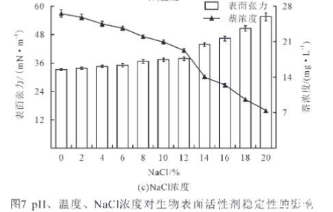 研究了石油降解菌BD-2產(chǎn)生的生物表面活性劑在不同pH、溫度和NaCl濃度下的穩(wěn)定性。如圖7(a)所示,在pH小于4時,萘濃度顯著下降(P<0.05),發(fā)酵液的表面張力顯著上升(P<0.05)。當(dāng)pH為4~10時,表面張力和萘濃度沒有顯著變化(P>0.05),當(dāng)pH為10~12時,隨著pH的增加,發(fā)酵液中萘濃度下降,而表面張力此時上升,并且差異都顯著(P<0.05)。結(jié)果表明該菌產(chǎn)生的生物表面活性劑具有較好的耐酸堿能力。