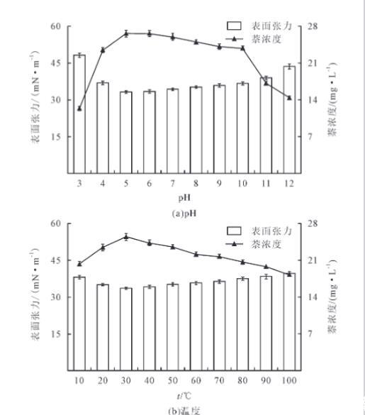 由圖6(b)可得,在10~30℃表面活性劑量明顯增加,在30℃時表面活性劑量達(dá)到最大,為2.18 g/L,表面張力明顯降低,從38.2 mN/m降低到23.2 mN/m;而溫度超過30℃后表面活性劑量顯著下降(P<0.05),表面活性劑量由2.18 g/L降低到0.85 g/L。表面張力顯著增加(P<0.05),表面張力由23.2 mN/m增加到35.1 mN/m。