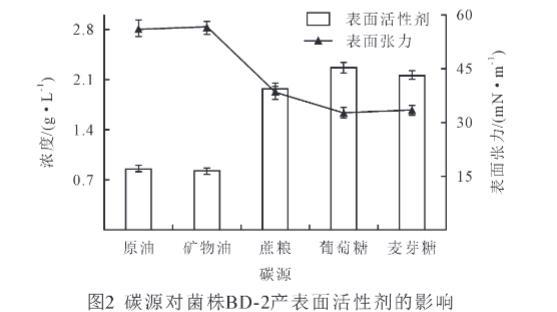 碳源對微生物的生長和次生代謝產(chǎn)物的產(chǎn)生有重要的影響。由圖2可知,不同碳源對菌株BD-2產(chǎn)表面活性劑量的影響不同,本實驗將原油、礦物油作為一類復(fù)雜碳源,葡萄糖、麥芽糖、蔗糖作為簡單碳源,進(jìn)行對比分析發(fā)現(xiàn),以簡單碳源作為底物時,菌株BD-2產(chǎn)表面活性劑的量顯著高于復(fù)雜碳源(P<0.05),其產(chǎn)表面活性劑量大小依次為葡萄糖>麥芽糖>蔗糖>原油>礦物油。同時以簡單碳源為底物時,菌株BD-2能顯著降低發(fā)酵液表面張力(P<0.05),其發(fā)酵液表面張力大小依次為原油>礦物油>蔗糖>麥芽糖>葡萄糖。在簡單碳源中,以葡萄糖為碳源時,菌株BD-2產(chǎn)生的表面活性劑的量最高,為2.26 g/L,而表面張力最低,為32.7 mN/m。研究結(jié)果表明,簡單碳源有利于菌株BD-2產(chǎn)表面活性劑。因此,選擇葡萄糖為菌株BD-2的碳源。