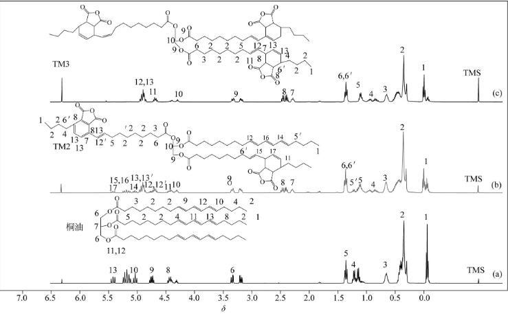 桐油中的共軛不飽和鍵與馬來酸酐易發(fā)生Diels-Alder(D-A)反應(yīng),生成桐油酸酐,反應(yīng)條件對(duì)產(chǎn)物的分布具有重要影響。由于桐油為混合物,每分子中有3條不飽和鏈,控制MA的加入量及反應(yīng)條件,可以控制桐油二酸酐(TM2)和桐油三酸酐(TM3)的形成。文獻(xiàn)報(bào)道大多數(shù)桐油和馬來酸酐反應(yīng)以有機(jī)錫為催化劑,經(jīng)過研究發(fā)現(xiàn),溫度對(duì)馬來酸酐與桐油反應(yīng)影響較大,溫度低反應(yīng)很慢,有機(jī)錫催化劑并不能明顯降低反應(yīng)溫度。在無催化劑的條件下,以紅外光譜跟蹤80℃、100℃、120℃及140℃下桐油與3倍量的馬來酸酐反應(yīng)的情況,結(jié)果表明80℃下反應(yīng)緩慢,100℃反應(yīng)1h后桐油的共軛三鍵的紅外吸收峰幾乎完全消失,反應(yīng)程度能達(dá)到96%。桐油及桐油酸酐的FTIR如圖1所示,991cm–1為桐油共軛三鍵的面外彎曲振動(dòng)紅外吸收峰,兩倍量馬來酸酐與桐油反應(yīng)的產(chǎn)物(TM2)中991cm–1的吸收峰明顯減弱但未消失,3倍量馬來酸酐與桐油反應(yīng)的產(chǎn)物中該峰完全消失,說明桐油分子上的共軛三鍵可以同馬來酸酐反應(yīng)形成三酸酐TM3。