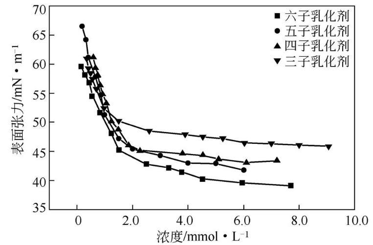 將桐油三酸酐和桐油三酸酐與甲基丙烯酸β羥乙酯反應(yīng)后的產(chǎn)物TM3H1及TM3H2水解,形成羧基官能團(tuán)數(shù)為4~6的丙烯酸酯改性的桐油基衍生物,TM3H3含有3個(gè)羧基。將羧酸改性的桐油用堿等當(dāng)量中和,形成含3~6個(gè)羧酸鈉基團(tuán)的桐油基衍生物,簡(jiǎn)稱為3~6子乳化劑。桐油及乳化劑的表面張力測(cè)試結(jié)果如圖5所示,與純水(實(shí)測(cè)表面張力69mN/m)相比,4種多子乳化劑均能降低水的表面張力。表面張力隨其濃度的增加而下降,當(dāng)乳化劑濃度大于2.5mmol時(shí),溶液的表面張力隨濃度的變化趨于平穩(wěn),逐漸接近水平。乳化劑濃度為1.5mmol/L時(shí),3~6子乳化劑表面張力分別為50.2mN/m、48.8mN/m、47.2mN/m和45.2mN/m。