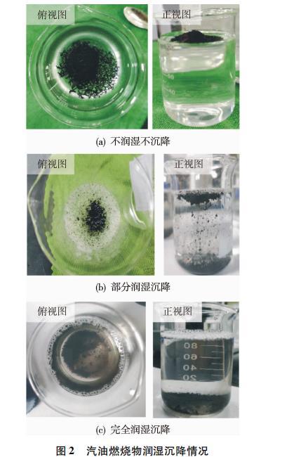 煙氣收集凈化裝置主要由置液桶、通氣管、離心式風機、吸氣管、集氣罩和燃油池等組成,其凈煙工作原理如圖3所示。風機抽走集氣罩下燃油池中汽油燃燒的黑煙,將其通入桶內發泡液中;氣體進入液體后會立刻浮出液面,在液體表面張力作用下排出液面的煙氣被液膜包裹成含煙氣泡;隨著煙氣不斷被通入發泡液中,含煙泡泡很快就溢滿整個置液桶。實驗前測量并記錄水及發泡液的pH值。