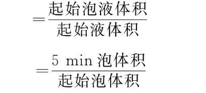 泡沫性能:用振蕩法測定,即室溫(25℃)下,在100 mL具塞量筒中加入30 mL質(zhì)量分?jǐn)?shù)為0.5%或0.1%的待測溶液,用力振蕩10次,記錄泡沫和液體的總體積。靜置5 min,記錄泡沫體積。發(fā)泡力和穩(wěn)泡性計(jì)算公式: