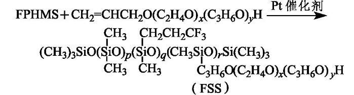 按n(Si-H)∶n(C=C)=1∶1比例將FPHMS和F6以及溶劑異丙醇加入裝有攪拌器、回流冷凝管和溫度計(jì)的四口燒瓶中,通N2,攪拌15 min,然后升溫至70——90℃,再滴加氯鉑酸醇溶液(以鉑計(jì),占總單體質(zhì)量分?jǐn)?shù)的4.0×10-5),并保溫反應(yīng)4——6 h后,于90℃、60 kPa真空脫低沸物30 min,冷卻,得淺褐色至褐色透明液體,即氟硅表面活性劑(FSS),其黏度為850 mPa·s,并溶于冷、熱水。反應(yīng)式為: