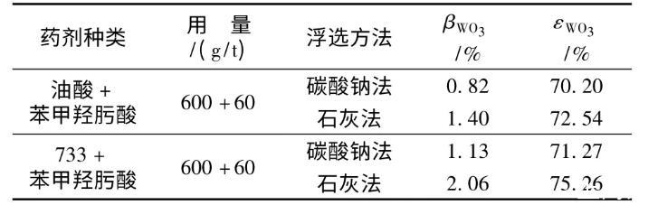 羧酸類捕收劑與苯甲羥肟酸是兩類典型的氧化礦浮選組合藥劑,兩者都可用于白鎢礦浮選,兩類藥劑的浮選試驗結果如表4所示。