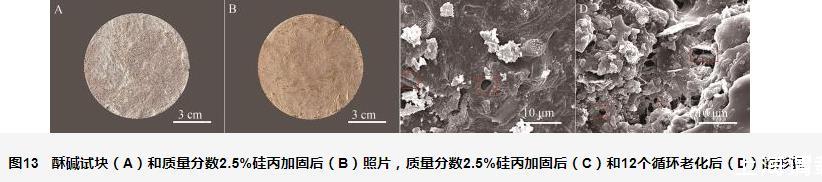 酥堿試塊(圖13A)經(jīng)硅丙乳液修復(fù)后再進(jìn)行濕熱老化12個循環(huán),肉眼觀察發(fā)現(xiàn)加固后的試塊(圖13B)表面無酥堿等病害。此外,對加固后以及12次循環(huán)老化后的試塊進(jìn)行SEM分析。從圖13C可以看出,修復(fù)加固后試塊內(nèi)部能看到明顯的成膜現(xiàn)象,說明硅丙乳液滲透加固性較好;而老化12個循環(huán)后(圖13D),成膜現(xiàn)象仍然存在,進(jìn)一步證明硅丙乳液具有較強(qiáng)的收縮性和耐老化性。因而可以將其作為性能優(yōu)異的膠結(jié)材料用于酥堿壁畫的修復(fù)中。
