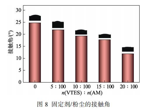 由圖8可知,共聚物水溶液與PTI-A2粉塵的接觸角均<90°,隨著VTES用量的增大,固定劑與PTI-A2粉塵片的接觸角逐漸減小。當n(VTES)∶n(AM)由0增加到20∶100時,接觸角從24.8°降低至11.9°,主要是因為VTES用量的增加賦予了共聚物水溶液更低的表面張力,而PTI-A2粉塵具有較高的表面張力,因而接觸角越來越小。固定劑與粉塵片的接觸角越小,表明固定劑能更好地潤濕氣溶膠粉塵顆粒,在空氣中固定劑與氣溶膠粉塵顆粒能更好地粘附。