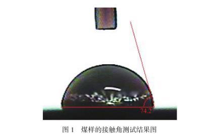 圖1為本實(shí)驗(yàn)所選煤樣的接觸角測試結(jié)果圖,由圖可以看出,煤樣的接觸角為74.2°,相較于其他類型的煤(接觸角為20.55°,22.34°,34.23°和29.75°),其接觸角明顯偏大,具有較強(qiáng)的疏水性。