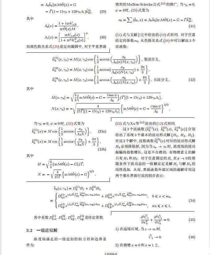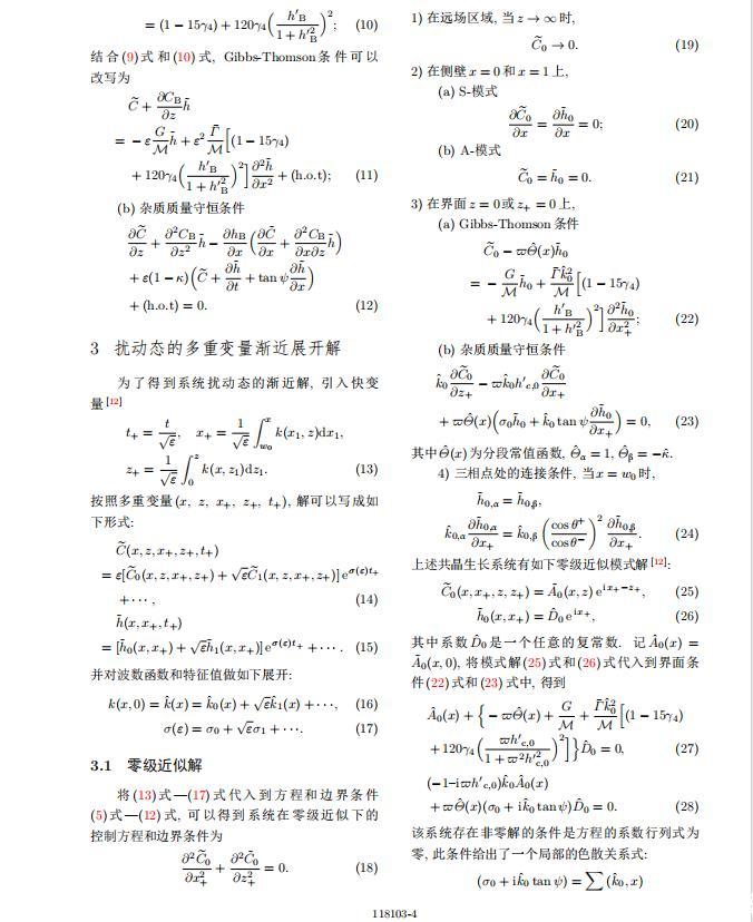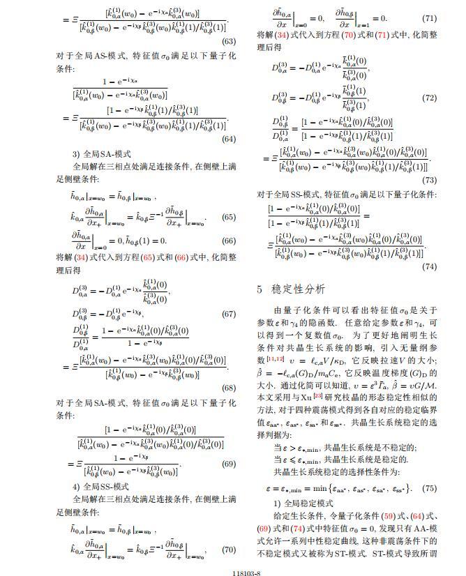 將系統(tǒng)方程以振幅遠(yuǎn)小于1進(jìn)行線性化處理,結(jié)合(1)式—(4)式,可以得到共晶生長系統(tǒng)的擾動態(tài)滿足以下控制方程和邊界條件: