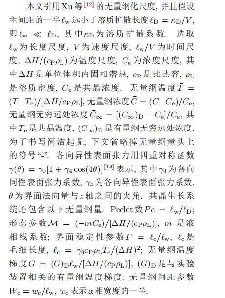 固體材料本身并非各向同性介質(zhì),其晶格結(jié)構(gòu)使固體體內(nèi)的物理量以及表面的物理參數(shù)依賴于取向,變?yōu)楦飨虍愋粤?固體材料這些物理參量的各向異性特征對凝固過程動力學(xué)與界面穩(wěn)定性機(jī)理以至對界面微結(jié)構(gòu)圖案的形成與選擇造成重要的影響[14].王志軍等[15,16]研究了各向異性表面張力對定向凝固過程中初始平界面穩(wěn)定性的影響,發(fā)現(xiàn)各向異性表面張力的非線性效應(yīng)導(dǎo)致界面傾斜生長.Chen等[17]研究了各向異性表面張力對定向凝固過程中球晶生長的影響,發(fā)現(xiàn)在各向異性表面張力作用下,球晶生長初始階段部分界面首先向內(nèi)移動,達(dá)到一定的熔化深度后向外移動.Xu[18]研究了各向異性表面張力對定向凝固過程中枝晶生長的影響,發(fā)現(xiàn)當(dāng)存在各向異性表面張力時,枝晶系統(tǒng)具有兩種不同的整體不穩(wěn)定性機(jī)理:震蕩不穩(wěn)定性與低頻不穩(wěn)定性.陳明文等[19]研究了各向異性表面張力對定向凝固過程中深胞晶生長的影響,發(fā)現(xiàn)當(dāng)各向異性表面張力增大時,深胞晶界面全長增大,根部低端的曲率半徑增大.本文應(yīng)用多重變量展開法研究各向異性表面張力條件下定向凝固共晶生長形態(tài)穩(wěn)定性,揭示了各向異性表面張力對共晶生長不穩(wěn)定性區(qū)域大小的影響.
